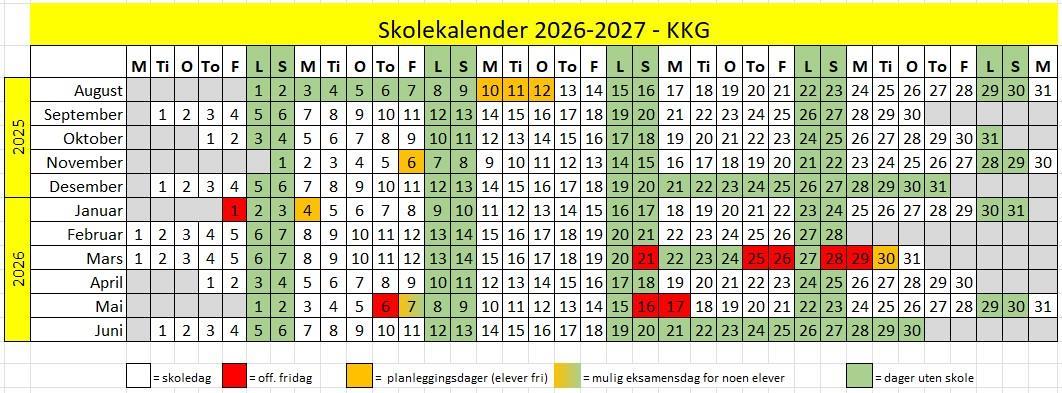 Skolerute og timeplanOversikt over skoledager, ferier og fridager. 2025-2026:Oversikt over skole- og fridager 2025-26Det kan komme endringer i tidspunkt på timeplan for 2025-26. Se kalenderen på forsiden for mer detaljert info om det som skjer i løpet av skoleåret.Fraværsreglene for vidaregående skole setter en grense på ti prosent i hvert enkelt fag. For å unngå fare med å overstige grensen ønsker vi derfor at elever legger private reiser og annen aktivitet til dager uten skole.Les mer om fraværsreglene i videregåande skole. Timeplan 1.time 08.00-08.502.time 08.50-09.403.time 09.50-10.404.time 10.40-11.30Lønsj/midttime 11.30-12.105.time 12.10-13.006.time 13.00-13.507.time 14.00-14.508.time 14.50-15.40 Lærere har fast møtetid onsdager fra kl. 14.00, men noen av disse tidspunktene kan også bli brukt til undervisning og/eller vurdering med elevene. Elevene finner timeplanen i sin InSchool-app. 2026-2027:Oversikt over skole- og fridager 2026-27AktueltAgder fylkeskommunes skolerute for alle skoler